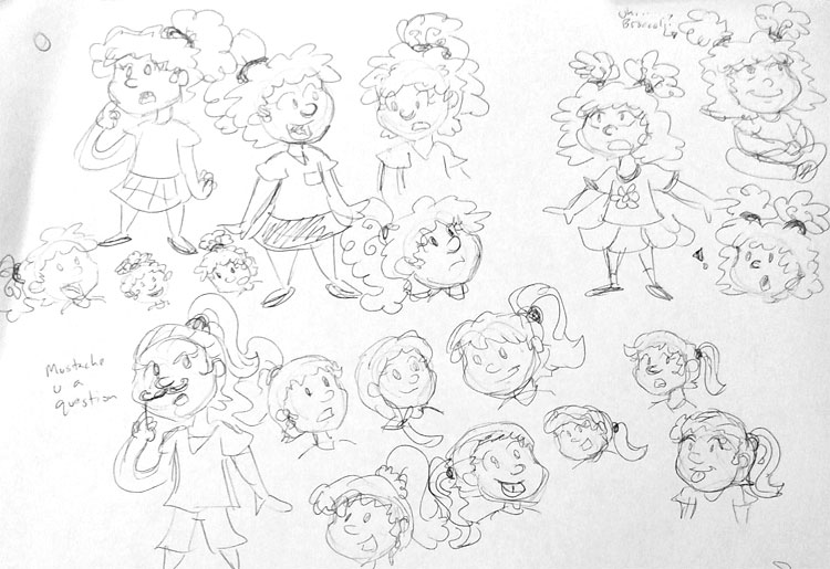 Concept sketches for hairstyles for Celia and Anna, which sometimes included broccoli hair.