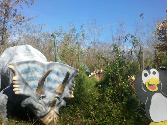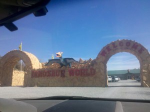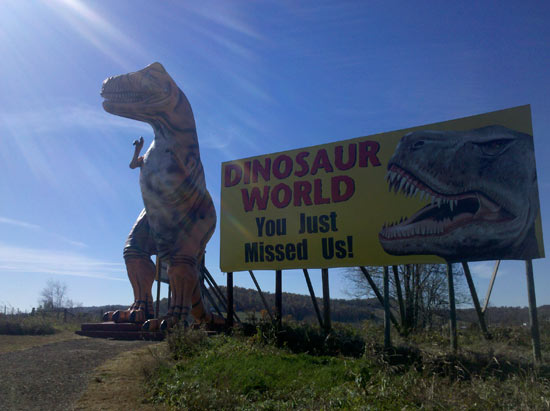 Actually, dinosaurs apparently live in three different locations according to the Dinosaur World website. Someone very smart realized that they could take large chunks of land off the highway, build a very large eye-catching sign accompanied by a dinosaur, and ensnare small children and dinosaur-minded adults into a side trip to see life-sized dinosaurs hanging out in the woods.