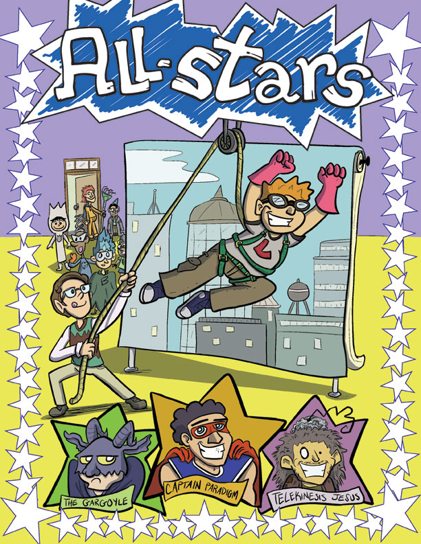 Meanwhile, in the magical land of Side Projectsâ„¢, the fine people of Hex Games have released another awesome game and I had the privilege of creating the cover! All-Stars is about the not-so-famous super heroes of Paradigm city and all the adventures you could be having as one! So it made complete sense to me that numerous low-budget heroes would line up in a random warehouse to have pulley-powered flying lessons. I requested the help of that handsome fellow that I married known as James Hornsby to create the All-Stars logo since I am still not as awesome at Illustrator or logo-makin’.