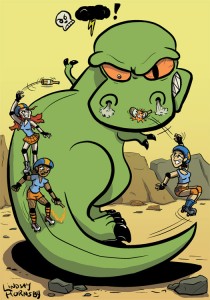 I also came to realization a couple of weeks ago that I drew Roller Derby girls fighting a T-rex, but only did it in black and white. The illustration was screaming for some color, so I made a point of coloring it recently.Eventually, I hope to get some prints made of this, in large part because I want a printed copy for myself. I’m delighted at how well it turned out.