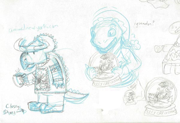 As referenced before, each Christmas me and that wonderful James Hornsby fellow create dinosaur-themed Christmas ornaments. Using our illustration skills and the magic of inkjet Shrinky-Dink paper, we added more jolly dinosaurs this year. As per usual, I drew a handful for James to ink and color and he drew the other half for me to ink and color.
