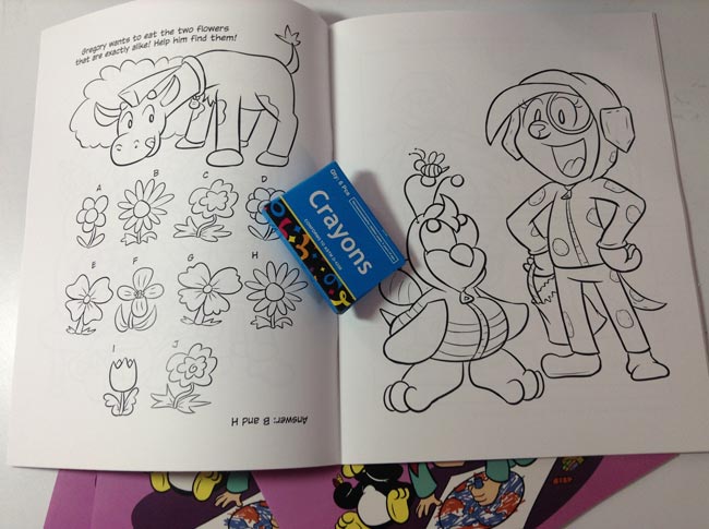 For the coloring books, I collected all of the current coloring pages from the past several months. I also drew lots of brand-new activity pages, including a word search, find the differences, and a connect the dots! Which are actually kinda weird and difficult to make, by the way. Plus, every coloring book includes a FREE MINI BOX OF CRAYONS, HECK YEAH!