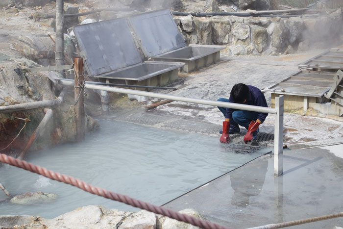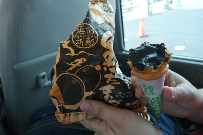 One of the most unique things about the area were the eggs available to purchase. The eggs are cooked in the naturally hot water in the bubbling pits, and as a result have their shells blackened from the sulfur. Eating one of these eggs is said to prolong one’s life by seven years. They’re also TASTY and frequently on objects of the souvenir variety in the gift shop. There was one additional blackened snack to get – black ash ice cream. Which really, tasted like whichever flavor you got (either Vanilla or Strawberry Milk), but looked black.